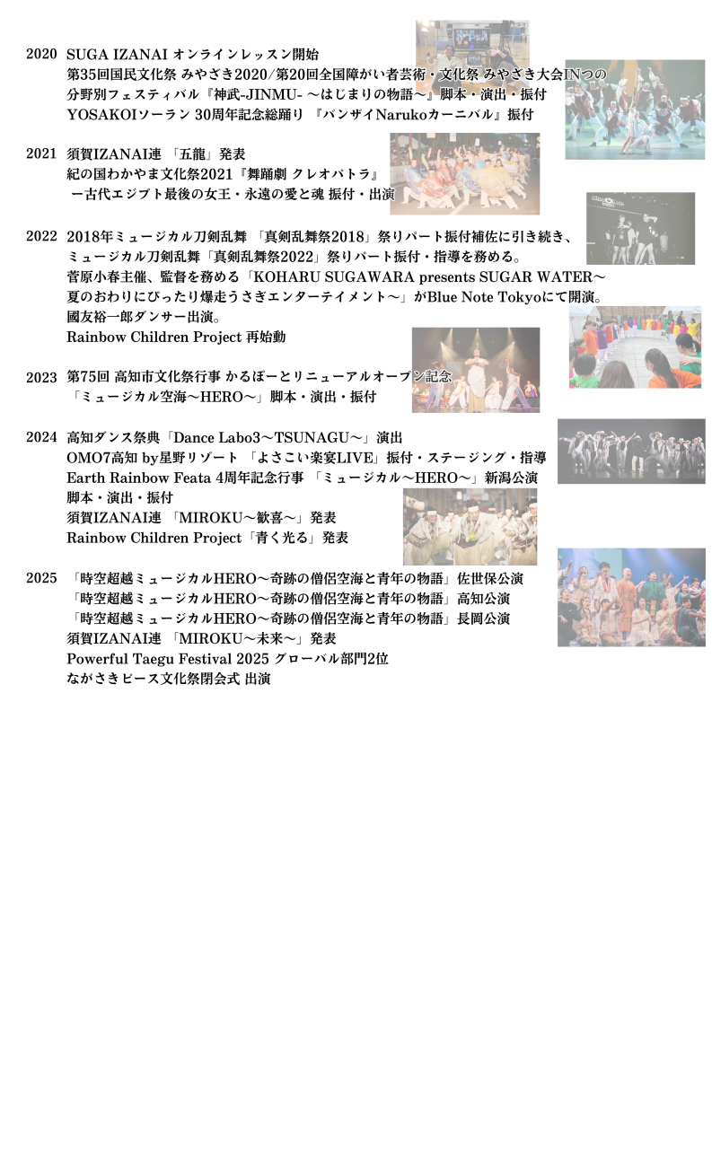国内外問わず多数の祭り、イベント、舞台で出演・振付•ステージングを行なっている。